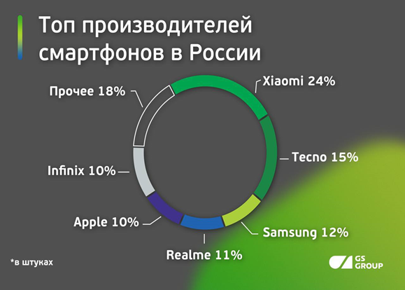 По результатам прошедшего года доля Xiaomi составила 24%, что связано с увеличением доли брендов Transsion Holdings. Tecno и Infinix, принадлежащих Transsion Holdings, уверенно занимают рынок в бюджетном и среднем ценовых диапазонах не только в России, но и в мире. Для примера, на территории РФ Tecno увеличил свою долю присутствия с 2022 г. в два раза, с 8 до 16%.